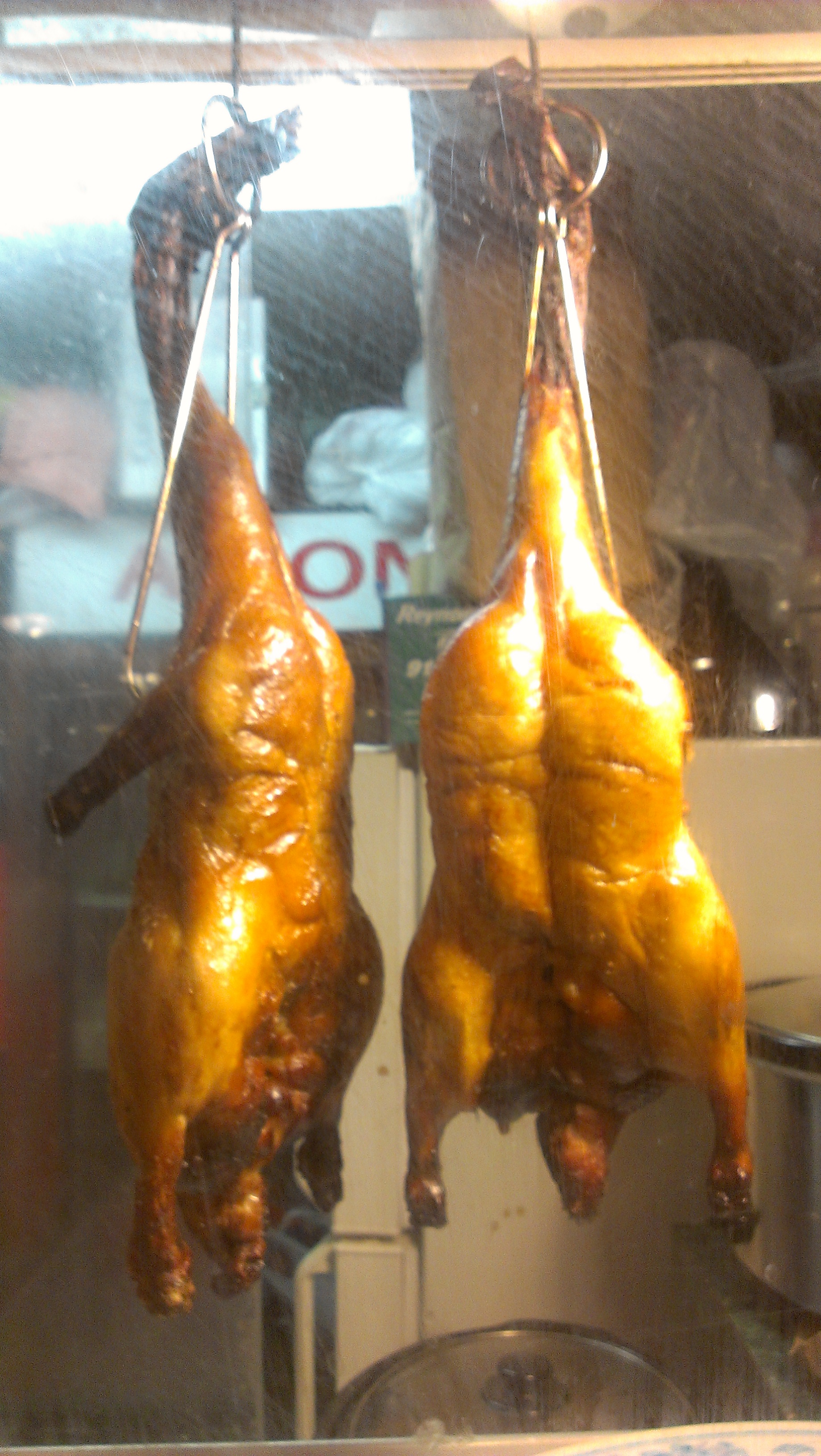 Peking Duck is made from a breed of duck called the Pekin. It’s a white bird with an orange bill and feet, and was the inspiration for Donald Duck. True story. Unlike the cartoon bird, real Pekin ducks do not wear blue sailor suits (but if they did, they would at least have the decency to put on a pair of pants). WARNING: DO NOT READ THIS NEXT PART IF YOU ARE SQUEAMISH OR ON THE FENCE ABOUT BECOMING A VEGETARIAN. Pekin ducks are raised in captivity for exactly 65 days, where they are force-fed 4 meals a day to fatten them up before being slaughtered, plucked, and eviscerated. Air is then pumped beneath the skin to separate it from the fat. The duck is then slathered in syrup and hung on a hook to dry for 24 hours before being roasted. Yummy, huh? Somewhere there is a Sarah McLachlan song waiting to be written.