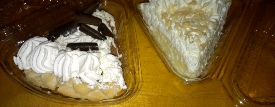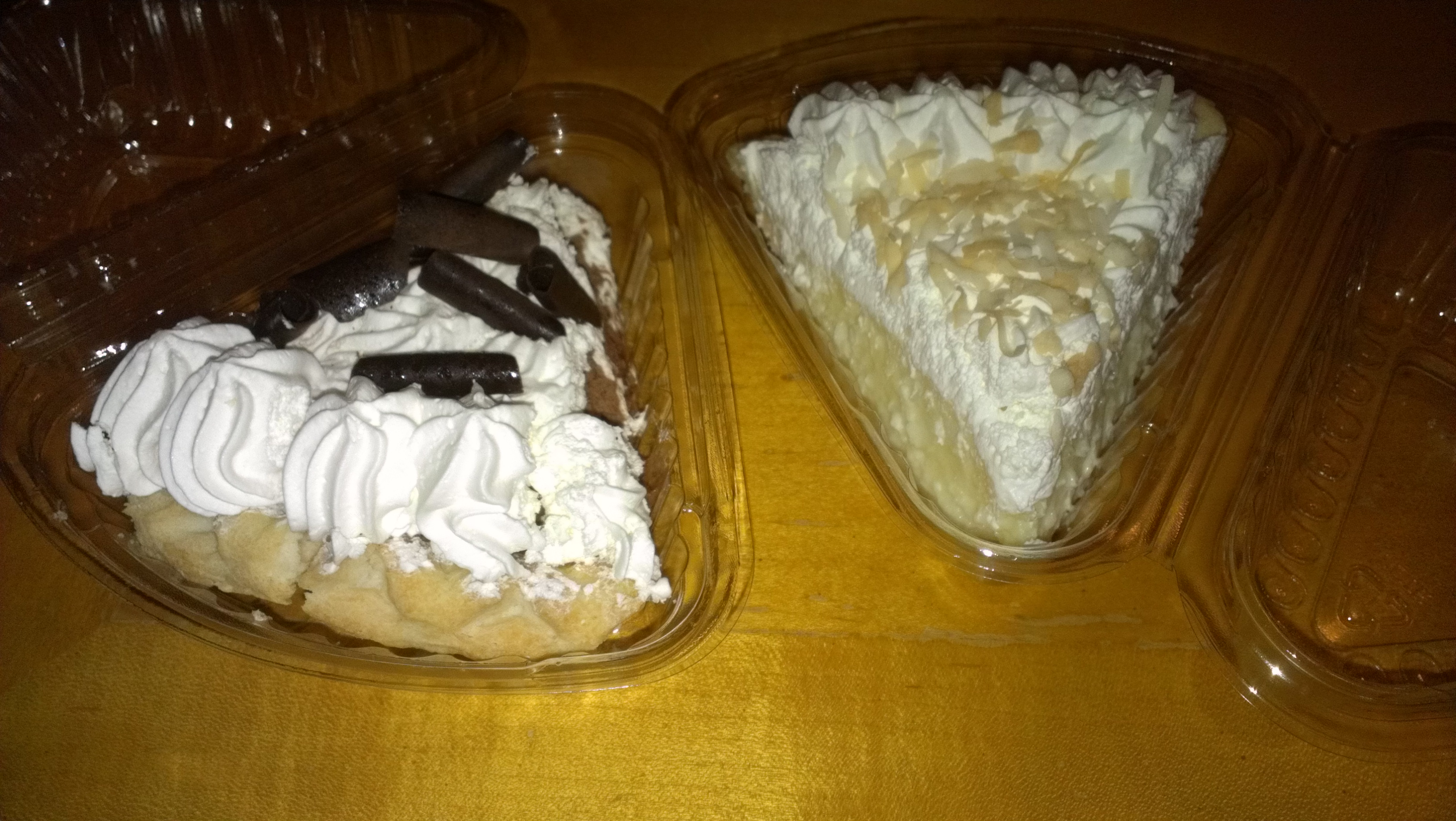Just kidding. They’re also known for their pies. And with a dozen varieties to choose from, we were in pie heaven. Could we have baked our own? Sure. Should we have baked our own? Maybe…but this challenge is tough enough without having to worry about making everything from scratch. Come June 9, I’ll bake my own strawberry-rhubarb pie. In the meantime, we enjoyed individual slices. I got coconut cream, she got chocolate silk. Suffice it to say, we enjoyed ’em both!