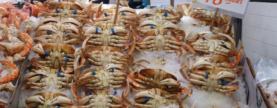 Tara and I are visiting family in Seattle this weekend, which gave us the perfect excuse to head down to Pike Place Market, an enormous public market overlooking Elliott Bay. Open since 1907, Pike Place is famous for its selection of fresh seafood. What better place to go to celebrate crab?