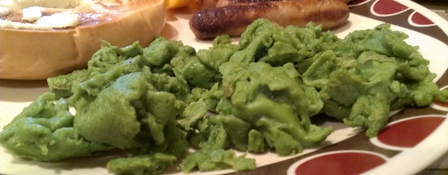 I do love Tara’s green eggs, and have become addicted to them myself. This is also a fun, great way to sneak a serving of vegetables onto a kid’s plate…they’ll never even taste the spinach. And if they balk, tell them it’ll make ’em big and strong. Just like Popeye.