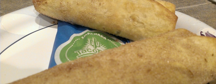 For some reason, I always pictured empanadas as a dessert item. Maybe that’s because there’s a booth at our local farmer’s market that sells sweet empanadas filled with a variety of fruits and dusted with sugar; these are very pie-like. Unfortunately, we were out of town and unable to stop by the farmer’s market to pick some up, so I had to do a little searching around town to find empanadas. I found out Taco Time, a regional Mexican fast-food place, had them, so I swung by the food court in the mall after work to pick up a couple. Granted, they don’t look like traditional empanadas, which are usually half-moon shaped, but they were filled with cherry and berry, dusted with cinnamon and sugar, and tasted pretty damn good.