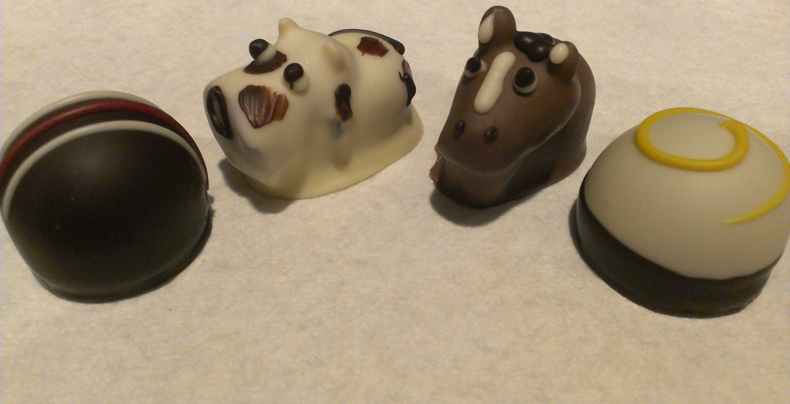 I spent a good five minutes surveying the glass display case for the perfect truffles to celebrate today’s holiday. After much deliberation, I settled on a milk chocolate cow and pony, a peach bellini truffle, and a raspberry chambord truffle. They were all delicious!