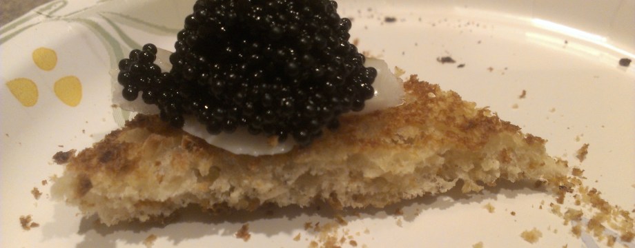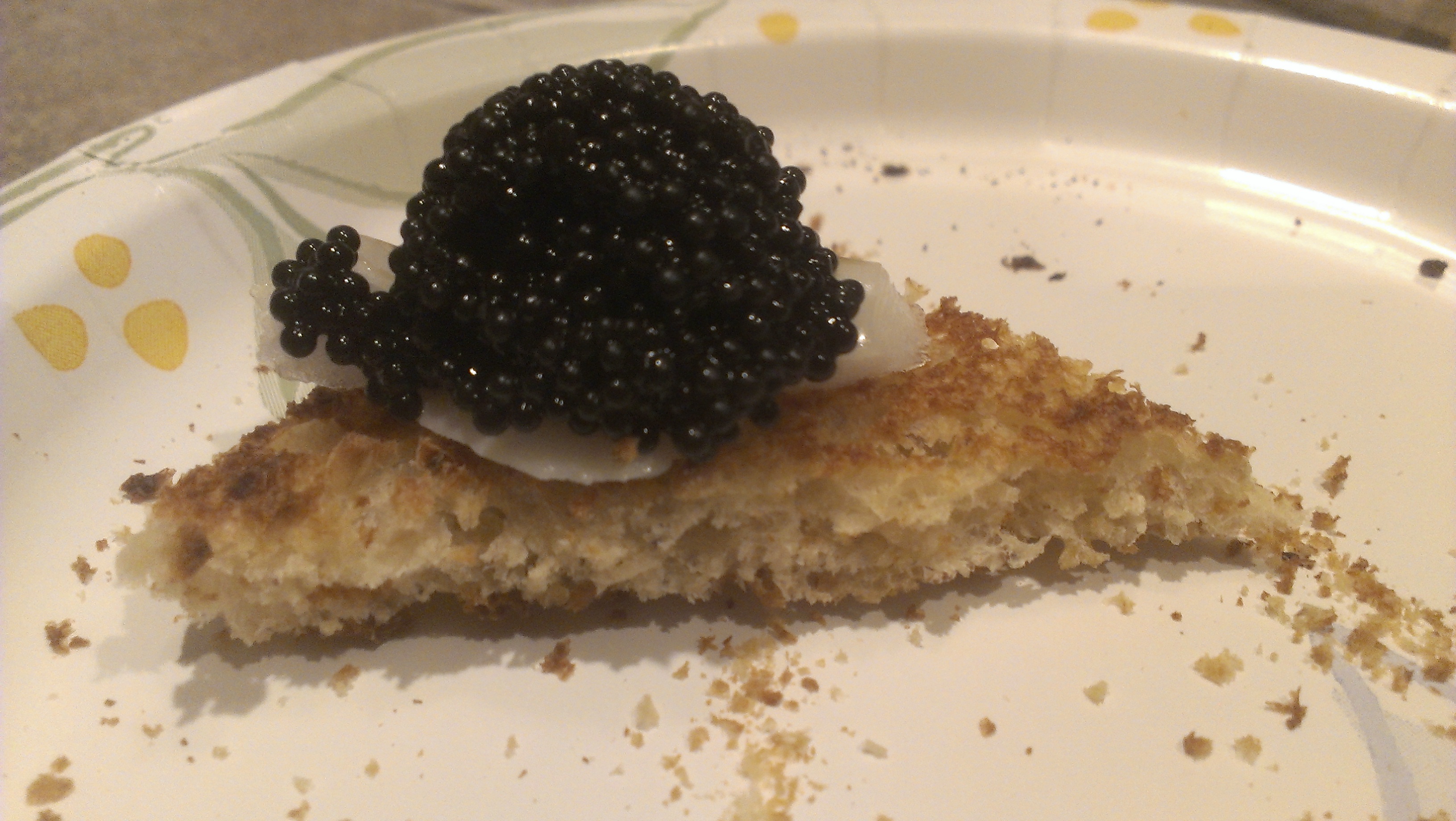 There are certain etiquette rules for serving caviar. You should never use a metal spoon, as this can affect the flavor. It’s best served with chilled vodka. A traditional preparation involves placing diced onion and hard-boiled egg on a toast point and topping with a generous dollop of caviar, with lemon slices on the side. We followed those rules, minus the lemon. I had tried caviar once before, but it was Tara’s first time. She was a trooper…but she very nearly vomited. I’m not exaggerating. I actually stepped away from her as she was gagging and dry heaving. Luckily, nothing came up. Funny thing is, I asked her afterwards, “So? Did you like it?”