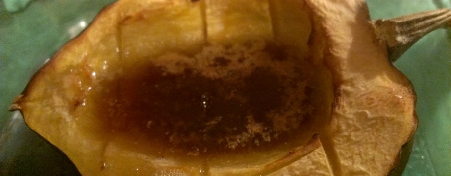We had never tried acorn squash before, though I buy it almost every year. Like candy corn, it’s a festive way to celebrate fall (and Halloween). I often have decorative gourds on display. We baked it, with a little butter, brown sugar, and maple syrup – the recipe follows – and served it as a side dish with some fried chicken and potato salad. We were both amazed by how delicious it tasted!