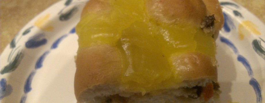 Interesting! We were all ready to bake our own hot cross buns from scratch; we even dragged out the bread machine and put it on the counter. And then, my mom called. “Guess what I found in the freezer? A package of hot cross buns!” How fortuitous. She had purchased these from Safeway right before Easter – of course, because that’s when they’re traditionally eaten – and for some inexplicable reason tucked them into the freezer and forgot about them. Her oversight benefitted us, though. We went over for dinner tonight, and for dessert, had the hot cross buns. These were topped with lemon, which I had never seen before, but still pretty good.
