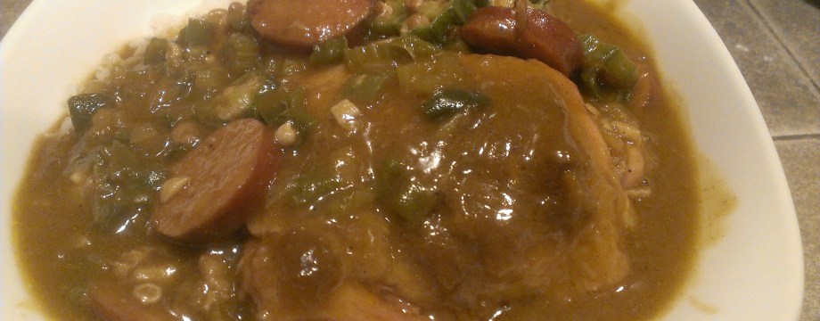 To celebrate, I decided to make a gumbo from scratch. This is no small feat, but on a cool and damp Saturday afternoon and with Tara recovering from a cold, it was the perfect opportunity to make a nice slow-cooked meal. I’ve made gumbo a couple of times in my life, but previously, I used a jar of roux a friend in Louisiana had sent my way. Unfortunately that jar was long gone, so I had no choice but to make my own roux. That alone is a 45+ minute process, but I was pleased with the results. I used a recipe from Donald Link’s Real Cajun cookbook, one of many I own from my days as a book reviewer. I deviated from the recipe in places, namely the roux, and the fact that it called for fried chicken but I just wanted to brown mine. Everything else was the same – the vegetables, seasonings, andouille sausage, etc. And I have to say, it turned out delicious! I was very pleased with the results, especially considering the fact that I’ve rarely ventured south of the Mason-Dixon line.