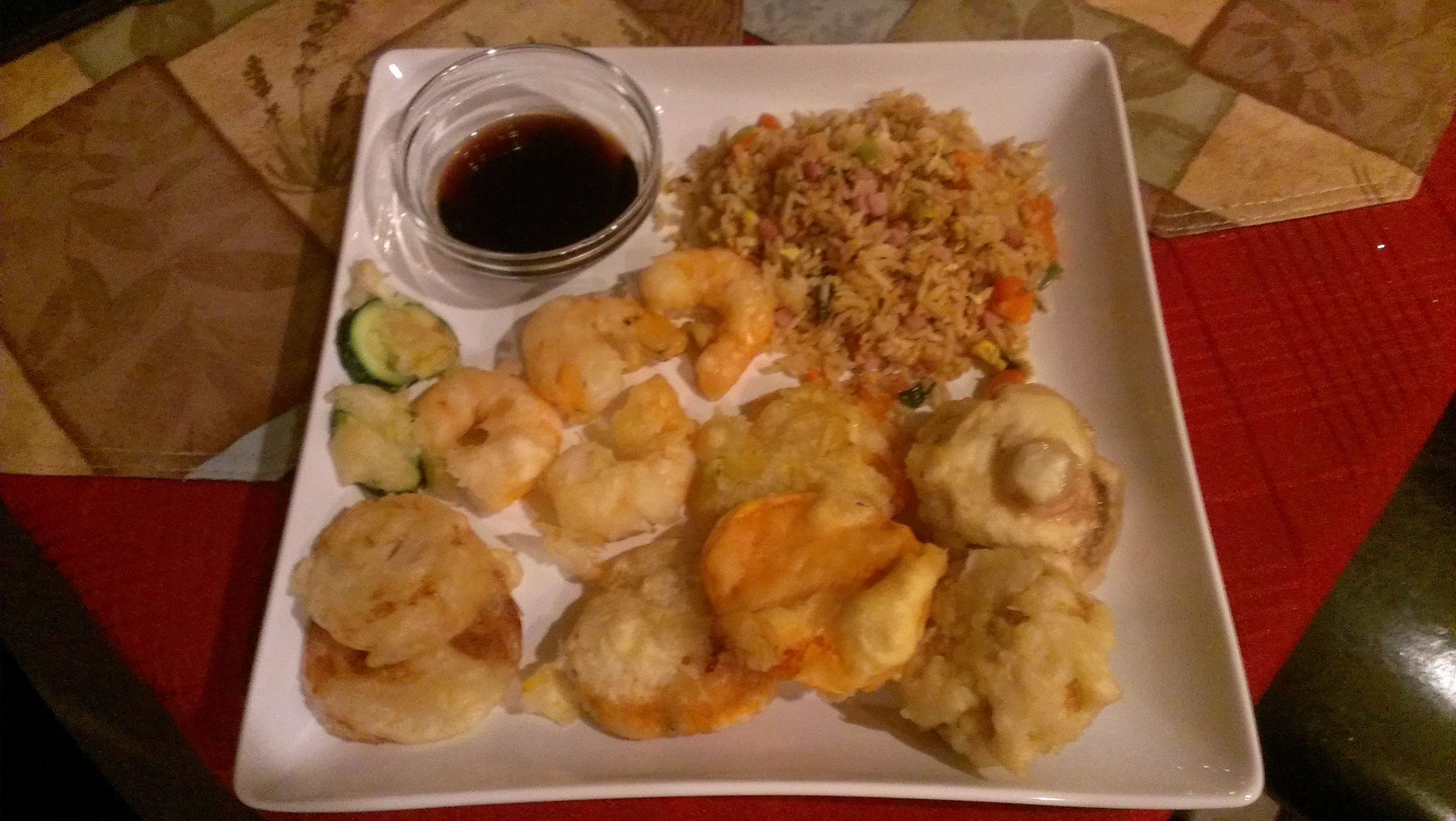 Back to tempura. I’d actually been craving it for some time, and had mentioned making it for Tara a while ago. I’ve owned a deep fryer for years (though using it remains a novelty), and I know from experience that tempura isn’t a complicated dish to make. We picked up a bunch of veggies – onions, mushrooms, yam, and zucchini – and a few large prawns. Those, a box of tempura batter and a bottle of dipping sauce, and we were all set. Tara’s not a fan of white rice, so she suggested we make fried rice to go along with it. Cross-cultural culinary conflict aside, I was game. She said she’d “pick up the packet” from the store on her way home, and I just looked at her. Packet? What packet?? Fried rice is easy enough to make without any preservative-laden help. But I feel I should offer her the chance for a rebuttal here.